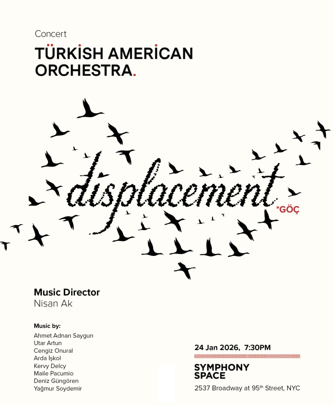 Past Concerts Sounds of Displacement - Göç January 24, 2026, Symphony Space NYC Gallery Moments of Istanbul June 14th, 2025, Neidorff-Karpati Hall, MSM Gallery A Celebration of Turkish Music October 26th, 2024, Peter Norton, Symphony Space Gallery